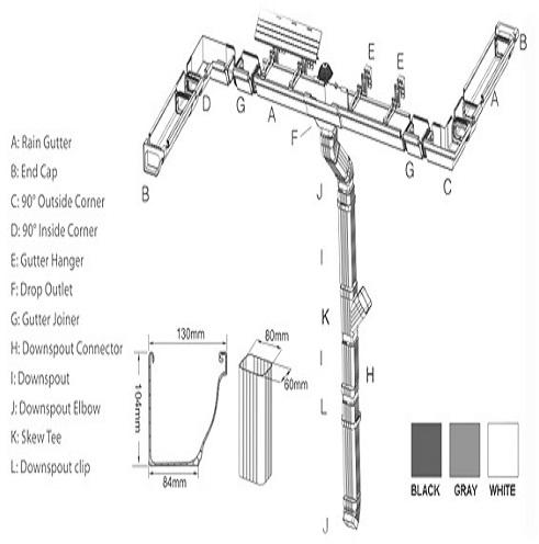 It is easy to install. There is no need for sealants or special tools. The gutter system will not rust. The gutter system will not dent or crack. Available in white and brown. Â
