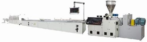 Pvc profile production line includes conical twin screw extruder, vacuum forming table, haul off machine, cutting machine and profile stacker.