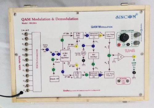 QAM Modulation: This circuit has four bit Data Splitter, 2-bit DACs, two Balance modulators wired using IC 1496, 900 RC Phase shifter network, two low pass filters and OP-AMP IC 741 as summing amplifier. The 12 bit digital data input with clock input is applied to four bit Data splitter network to split the data into four bits, which is then applied in pair to respective 2-bit DAC and balanced modulators with direct and 900carrier input to provide balance modulator outputs which is after LPF and summing network provides QAM modulated data output. On board 12 bit digital Data generator, Clock input, Sine wave carrier signal generators (1No) with variable frequency upto 100KHz and 10Vpp amplitude. facility to change the digital data input bits and carrier input. facility to connect external clock and data input. variation in phase and amplitude of carrier for the given data input pattern. 4-QAM system, maximum carrier frequency 50KHz, Discrete level circuit. QAM Demodulation: This circuit is wired with two mixers, 900 RC Phase shifter, two low pass filters, logical decision device circuit, multiplexers and OP-Amps to form QAM Demodulation circuit to provide the demodulated serial data output with minimum noise for the applied QAM input signal. QAM input, Digital Data input 12 bit, carrier reference input, maximum carrier input frequency 50KHz, QAM detector bandwidth upto 2KHz, Discrete level circuit, Built-in fixed DC ±12V/+5V/1A Power supply and maximum test point.