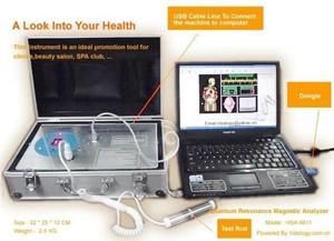 The method of quantum resonant magnetic analysis is an emerging rapid, accurate and non-invasive spectral testing method and particularly suitable for comparison of curative effects medicine and health products, and check of sub-health conditions. The main analysis items are over 30, including cardiovascular and cerebrovascular condition, bone mineral density, trace elements, blood lead, rheumatism, lung and respiratory tract, nephropathy, blood sugar, stomach and intestines, liver and gall, cranial nerves, gynecology, prostate, bone disease, the trace elements of selenium, iron, zinc and calcium, etc.