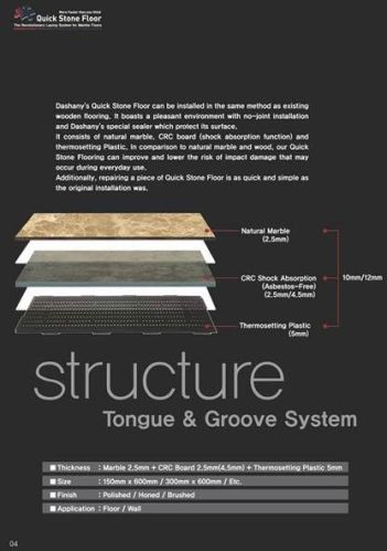 quick stone floor can be installed in the same method as existing wooden flooring. It boasts apleasant environment with no-join installation. It consists of natural marble, crc board (shock absorption function) and thermosetting plastic. In comparison to natural marble and wood,our quick stone flooring can improve and lower the risk of impact damage that may occur during everyday use.