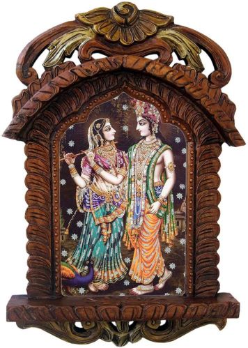 we are offering radha krishna playing flute wooden jharokha gift 437.this jharokha painting is made beautiful by the special designs in the anti termite wooden frame, it has divine painting of lord krishna and radha looking at each other and radha palying the flute, to clinch the attraction of the guests that come to your home. The beautiful colors of the painting enhances the divinity of the showpeice.