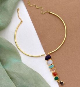 Contact SupplierThis unique, handcrafted necklace blends bold, modern style with natural elegance. It features a sleek, gold-toned choker-style chain that beautifully frames the neckline. A stunning pendant hangs from the center, showcasing a vertical bar of six raw, semi-precious stones. Each stone displays its own unique shape, texture, and vibrant color, creating a captivating and earthy contrast to the polished gold.