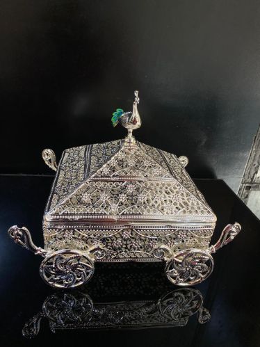 Add a touch of divine elegance to your home with this exquisite Rath-shaped dry fruit box featuring a stunning peacock lid. The intricate design and majestic peacock motif evoke the grandeur of Indian heritage, making it a beautiful piece for storing dry fruits or as a decorative accent."