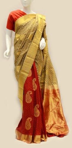 Cream and red dual toned raw silk saree with gold paisley patterns and gold pallu model : ac2 price : 10120 availability : 1 weight : 0.70 kg quantity : type > woven, occasion > ceremonial, party sarees, fabric > raw silk, kanchivaram silk, time to ship : 10