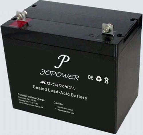 We are offering rechargeable sealed lead acid battery. model no.: jpd12-75 (12v75ah) type: lead-acid batteries size: 260*167*209*228mm packing qty.: 4 pcs/ctn lead-time: 15 days for one container application: emergency lighting, security system, ups, scooter trademark: jopower standard: ce, iso90000 origin: china hs code: 850720000 oem acceptable.