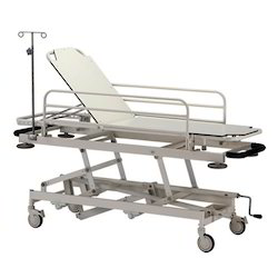 Frame made of rectangular CRCA pipes with collapsible side railing. Removable radiolucent top with X-Ray cassette holder. 4 section top with pneumatic mechanism for back rest and manual maneuver for knee rest. TrendlenburgReverse Trendlenburg position maneuverable using pneumatic pump. High – low maneuverable by hydraulic pump. Castors of 150mm dia. With diagonal locking are provided for mobility with control. Oxygen cylinder holder and SS IV stand. The complete metal components are pre treated and epoxy powder coated.