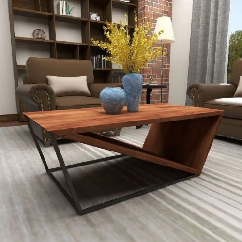 PRITI-Home Display Small Metal and Brown Wood Triangular Table