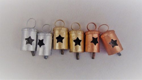 Materials: copper bells, tin, recycled metal, silver bells, gold bells, brass Each bell measures 2 1/4", and the clapper extends just a bit below that. They have gold, silver and copper paint applied in an all over manner (more uniformly) to give them a fresher look. They may have some bumps and wrinkles. The top hanger is thick and sturdy. They are just full of charm!!! These bells are in a CYLINDRICAL shape, and they have a big star cut out on each side.