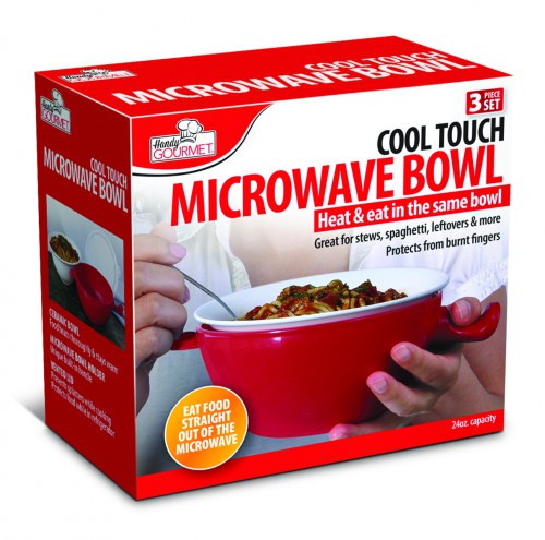 COOL TOUCH MICRO BOWL-RED Never Burn Your Fingers Again! Unique 3 piece set includes: ceramic bowl, outer microwave cooking bowl and plastic lid. Ceramic bowl fits inside cool touch bowl allowing the food inside to stay warm. Handy lid prevents splatters, keeping your micro ID JB6502 BRAND HGM CASE PACK 12 CASE WEIGHT 21 CASE LENGTH 16.2 CASE WIDTH 15.3 CONSUMER PACK 4 COLOR BOX CONSUMER PACK DIMENSIONS 7.48" X 7.08" X 3.74" UPC EAN NUMBER 017874008681