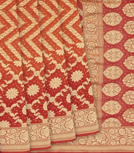 Red Handloom Banarasi Bandhani Khaddi Georgette Saree With Floral Jaal & Chevron Motifs