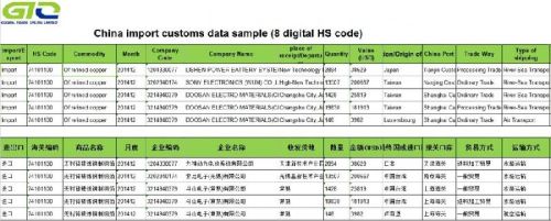 Contact SupplierRefined copper China import customs data includes the Chinese buyer name of refined copper, with price, quantity, original country, etc. Such kind of information can contribute to the international business. Detail Information about China Import Data China import data cover following points: Import, customs HS code, commodity, import month, enterprise code, enterprise name, amount, price, unit, destination (country of origin). declaration port, trade methods, transportation, transit country, fax, zip, email, contact person, enterprise nature, address, etc., all these information is now able to offer to the public in maximum by customs. The value of China import data 1. Scientific market strategy making and find buyers2. Evaluate new product or new production, the feasibility of market development 3. Deal with different market, make effective pricing strategy 4. Monitor competitors, trade characteristics and business trends 5. Minimize export cost 6. Reduce inventory, speed up the capital rotary About our company Introduction of Global Trade Online LimitedGlobal Trade Online Limited--endeavour their sincerity work over seven years and has already been the leader in global trade data field. Global Trade Online Limited owns the world`s largest trade statistics database which has already been the strong tool for us to be the professional prompter for international trade.