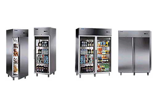 Versions 700 and 1400, depth 800 mm Electronic control panel Normal temperature (TN) or low temperature (BT) Integral unit Ventilated refrigeration or static refrigeration Available with full doors, half doors, glass doors and sliding glass doors Revesible doors Available with one, two or three different temperatures Automatic defrost and condensing water evaporation Lock with key (only full doors) Lighting (only versions with glass doors) Refrigerant fluid