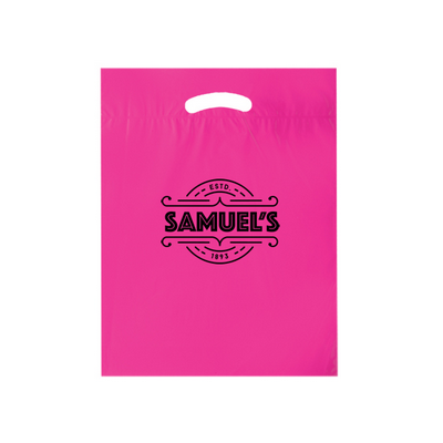 Tuck away all of your event or party favors into this Die Cut Bag. Lightweight and easy to carry, this plastic bag features a die cut fold-over reinforced handle with a 3" gusset, 2.5 mil low density film thickness and measures 12" x 15". These bags are also recyclable and a great way to go "green". Choose from a variety of bag and imprint colors to customize these bags to your liking. *Black, Hunter Green, and Navy Blue bags can only be printed on with Silver, Gold, or Copper ink. Complies with CPSIA, Prop 65. 12" W x 15" H x 3" D Request Info