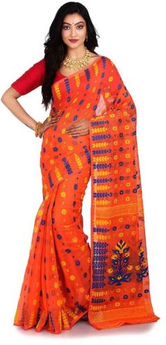 Orange dhakai jamdani sareewith multiple coloured thread works. The borders are woven in a stylish longitudinal motifs and body of the saree have butis and flower motifs. The pallu features a floral design in tiles pattern. No blouse piece is available. This saree also comes in different colour combinations like red, yellow and green designs; red and green designs on the base of tusser colour.