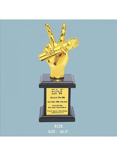 Golden platted resin mic on black wooden base, mic holded in a resin golden platted hand showing the victory, for champions Black & golden -720/pc Premium and high quality trophies and awards. Size Available: Small, Medium, Large. Fully customized. Price may vary according to the design.