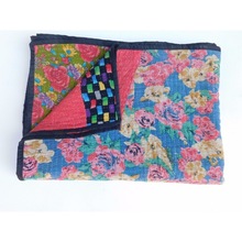 100% Cotton Kantha Floral Patchwork Reversible Sari Quilt, Technics : Handmade