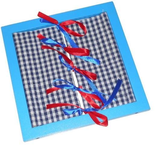 2 flaps of cloth that can be fastened with ribbons are fitted on a painted wooden frame. Used to introduce the child to fastening/ unfastening bows. The cloth can be removed from the frame for ocassional cleaning.Difference with Premium: Differences is in the material used for making the frames. Also, the cloth used is different in the economy and premium range. Also, the frames are painted in the economy version whereas in the premium range the frames are polished wood.    Â
