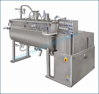 The Ribbon Vacuum Mixer Dryer consists of a jacketed cylindrical shell with rotating with specially designed Double Helical Ribbon Agitator type blade by rigid fabricated structure motor, gear box. There is provision for application of vacuum inside the shell and circulation of heating media in the jacket during the rotation of the stirrer. The large heating surface area presented by the internals of the cylindrical shell ensures uniform drying of the product, as the product gently moving while the ribbon stirrer rotates. The diffusive action induced by the mixing stirrer constantly presents a fresh layer to come into contact with the indirectly heated walls of the shell. A well designed sealing system enable maintenance of deep vacuum inside the shell, and also ensures positive circulation of a heating media in the jacket.