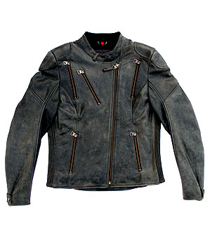 Leather. Front Zip Closure. Comfort Collar. Overlapping collar with two snap closure. Full ventilation; Front upper zipper air vents and one back zipper air vent with perforated leather. Front zip pocket on chest. Two side zipper pockets. Zippered wrist cuffs with snap closure. Padded Elbows. Padded Shoulders. Spandex on side back and waist. Adjustable snap closure at the back bottom. Mesh lining with screen print for good ventilation.