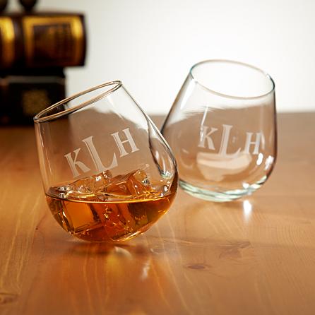 These stunning glasses enhance the pleasure of drinking or whiskey by creating a swirling motion when set down. This motion increases the oxygenation of the spirits while creating a wonderfully aromatic experience for the drinker. Made of glass. Holds 12 oz. Measures 4"H. Hand wash. Set of 2 glasses. Sand blasted with any 3-letter monogram with raised middle initial. Item