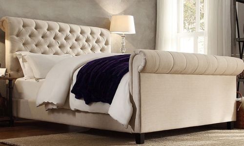 This Oxford Rolled Top-Tufted Sleigh Bed Frame features a sleigh foot-board design and is covered in a soft fabric with foam padding