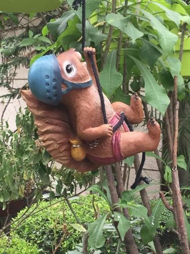 This climbing squirrel wearing blue helmet can be hung inside or outside your home. It is perfect for home or garden decor. L X W X H in cms : 15X11.5X20.5 Material : Poly Resin