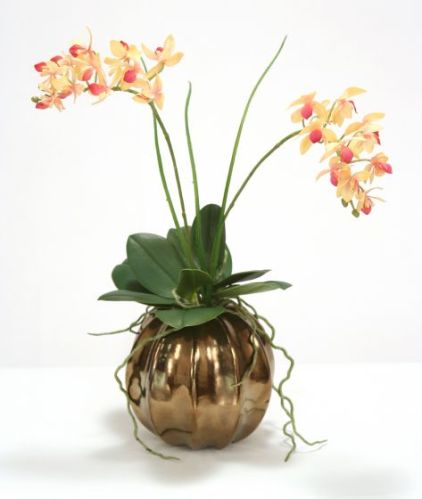 9849# - Rose Pink Cream Mini Orchid in Burnt Gold Ball Vase Container Material Earthenware Dimensions Height" x Width" x Depth" 15 x 13 x 7 Dominant Color Gold Dominant Color Family Metallics Shipping Weight 7 Ships