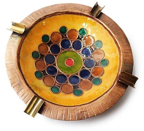 We are offering round ashtray. Not just as an ashtray, this decorative piece made out of copper and glass enamel colours with a bright yellow flower in the center also serves as a mood-lifter. size - 6'' dia (inches).