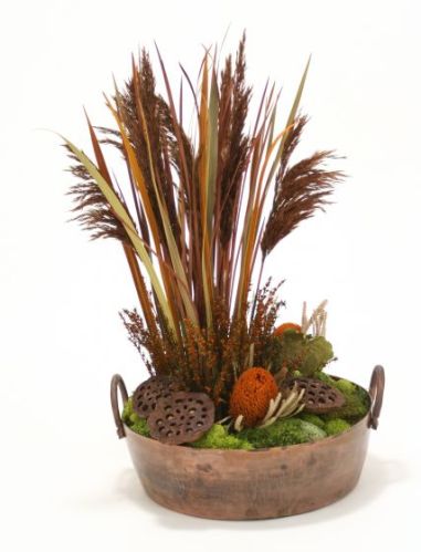 Natural Plumes, Blade Grass and Protea in Round Copper Planter with Handles Container Material Metal Dimensions Height" x Width" x Depth" 29 x 15.5 x 14.5 Dominant Color Nutmeg Dominant Color Family Browns Shipping Weight 13.2 Ships
