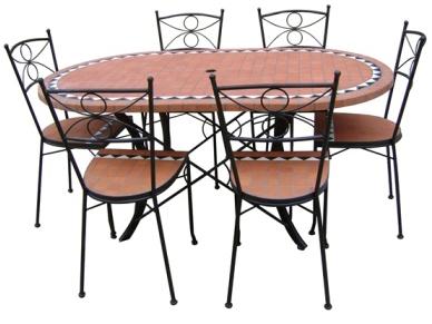 We are offering round dining outdoor table. Round dining outdoor table - table base: powder coated wrought iron, antirust treatment, weather resistant, knock down system - table top: terra cotta mosaic, concrete base, iron structure, water proof treatment.