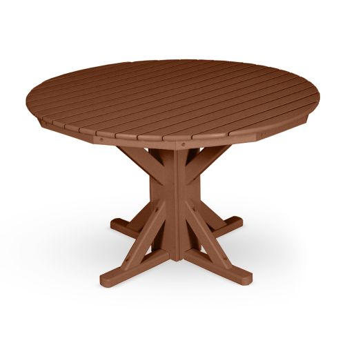 The large round top easily accommodates up to 4 Dining Chairs. Pedestal allows chairs to tuck under table when not in use. Dining, Counter and Bar Height Available Maintenance-Free Recycled Plastic Aluminum Embedded inside Framing With or without umbrella hole Color Coated Stainless Steel Hardware No Painting or Winter Storage UV Stabilized Against Fading