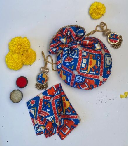 Patola Potli: Digitally printed Patola with double line cushioning and silk lining, amped up with bling tassels, carry traditions in style and elegance with our Patola Potlis, idle for gifting and giveaways Material: Silk with fibre bead laceTassels: signature lumba with wood covered glass beads and copper beads growthSize: 9.5 inches by 9 inches Pocket Square: Coordinate for the male other half to make a style statementSize: 8 inches by 8 inchesDigitally printed patola on both sides