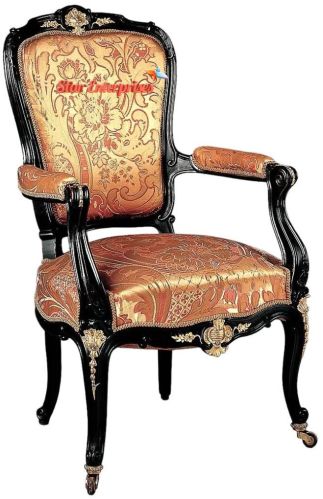 Luxurious quality teak wood chair with a glossy black finish. Intricate gold hand carvings on backrest and legs. Soft, comfortable fabric upholstery for cozy seating. A timeless design that adds elegance to dining space.