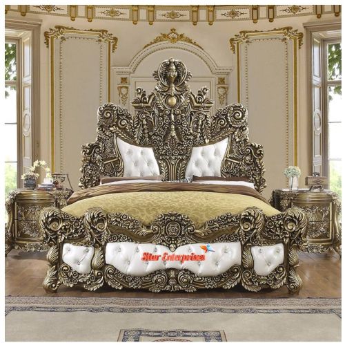 The bed also includes a dressing table with huge mirror frame in metallic gold polish with heavy carving add a great graceful appearance in any space. It also include ample storage for for your accessories and other belongings. Wooden Royal Maharaja King Size Bed from Star Enterprises is a brand of unparalleled luxury and grace.