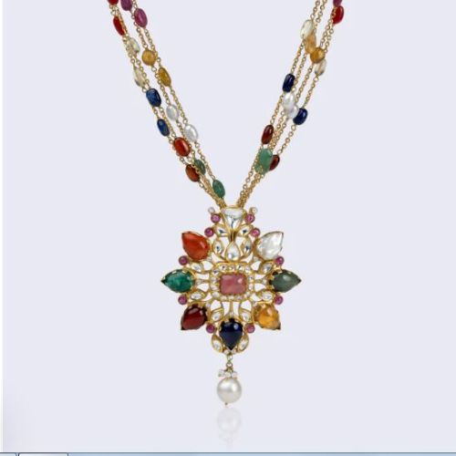 Contact SupplierThis breathtaking royal multicolor polki necklace showcases the pinnacle of Indian jewelry craftsmanship with its magnificent starburst pendant featuring an array of precious gemstones. The centerpiece displays vibrant emeralds, rubies, sapphires, and citrine stones in a stunning sunburst design, complemented by multi-strand chains adorned with colorful gemstone beads and finished with an elegant pearl drop.14K Hallmark GoldGross Weight - 59.77 gmsNet Gold Weight - 23.293 gmsDiamond Weight - 0.31 CtPolki Weight - 1.86 Ct