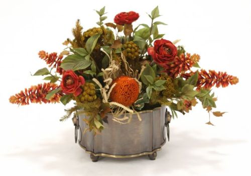 3351# - Rust-Gold Fall Mix in Bronze Scalloped Square Planter Rust-Gold Fall Mix in Bronze Scalloped Square Planter Container Material Metal Dimensions Height" x Width" x Depth" 16 x 24 x 18 Dominant Color Rust Dominant Color Family Oranges Shipping Weight 5 Ships