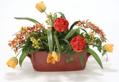 7459# - Rust, Green, Gold Garden Flowers in Oval Red Ceramic French Tureen Container Material Ceramic Dimensions Height" x Width" x Depth" 23 x 36 x 19 Dominant Color Indian Summer Mix Dominant Color Family Mixed Shipping Weight 7 Ships
