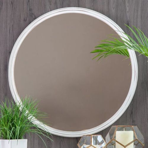 Add an extra element of brightness to your home with this rustic round mirror. The wooden frame sports several ridged details and is painted a distressed white.