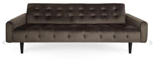 RUTLEDGE SOFA Tailored tufting and button details on a sleek low-slung seat, upholstered in lustrous mink velvet, create the perfect blend of moody glamour and icy attitude. Perched on ebonized wire-brushed oak legs, expertly pitched and graciously deep, the Rutledge Sofa is posh enough for a parlor but comfy enough for a man cave.