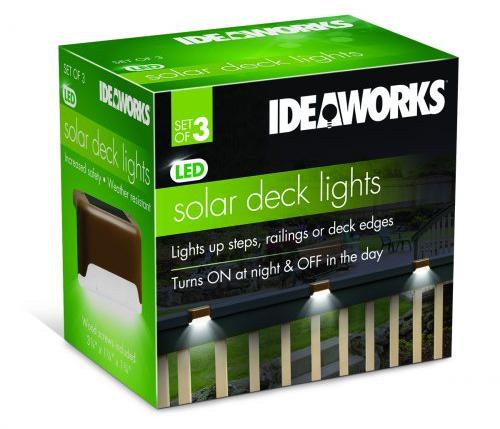 S3 SOLAR DECK LIGHTS Light steps, railing & deck edges to help increase visibility & prevent tripping. Solar powered so they automatically charge by day & light by night. Easy to install. ID JB7816 BRAND IDW-GNO CASE PACK 48 CASE WEIGHT 18.95 CASE LENGTH 16.10 CASE WIDTH 15.70 CONSUMER PACK 4 COLOR WINDOW BOX WLOCKING TAB CONSUMER PACK DIMENSIONS 3.6" X 2.6" X 3.4" UPC EAN NUMBER 017874023905