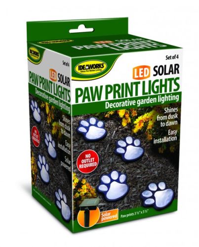S4 SOLAR PAW PRINT LIGHTS Decorative garden lighting. Shines from dusk to dawn. Solar powered (battery included). No outlet required. Easy installation. ID JB7356 BRAND IDW-GNO CASE PACK 12 CASE WEIGHT 11.65 CASE LENGTH 23.2 CASE WIDTH 11 CONSUMER PACK COLOR BOX CONSUMER PACK DIMENSIONS 5.3 X 4.5 X 8.3 UPC EAN NUMBER 017874016006