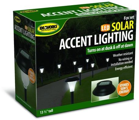 S8 SOLAR ACCENT LIGHTING No wiring needed to install. Soaks up the sun's energy by day...Shines brightly at night. White LED light illuminates walks, gardens and patios. Weather resistent. Energy efficient. Approximate size 17.9" x 4.5." ID JB5629 BRAND IDW-GNO CASE PACK 6 CASE WEIGHT 16.9 CASE LENGTH 15.8 CASE WIDTH 12.7 CONSUMER PACK COLOR BOX CONSUMER PACK DIMENSIONS 11.7 X 5.4 X 10.10 UPC EAN NUMBER 017874002979