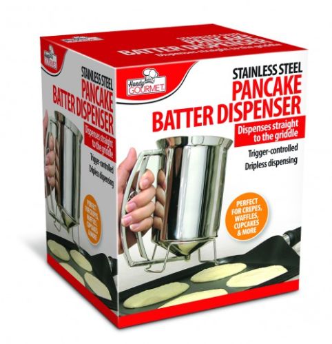 SS PANCAKE BATTER DISPENSER Modern stainless steel design. Dispenses straight to the griddle. Accurately dispenses batter for consistent pancakes every time. Trigger-controlled dripless dispensing. Perfect for crepes, waffles & cupcakes. ID JB4672 BRAND HGM CASE PACK 24 CASE WEIGHT 19.6 CASE LENGTH 28.3 CASE WIDTH 13 CONSUMER PACK COLOR BOX CONSUMER PACK DIMENSIONS 5.5 X 5.5 X 6.75 UPC EAN NUMBER 017874146727