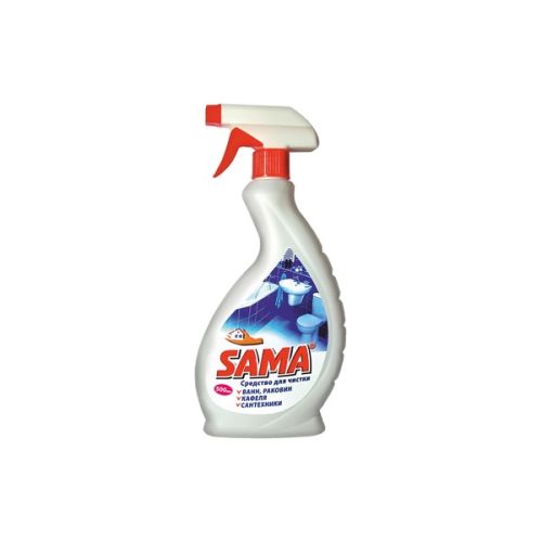 Newest universal means for cleaning sinks, tubs, tiles TM "SAMA®" return radiant shine and cleanliness sinks, baths, water taps, toilet bowls, metal and enamel surfaces, tile, ceramic tile and marble. Cleans thoroughly and quickly, without damaging surfaces. Means for cleaning sinks, tubs, tiles TM "SAMA®": plastic bottle of 500 ml. Packaging: corrugated cardboard boxes for 18 bottles each.