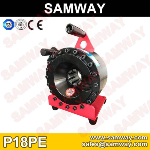 Samway P18PE Hydraulic Hose Crimping Machine Feature description Elbow 90 dgree hose up to 1" Portable 1" 4SP Crimper No electricity required Optional Enerpac Pneumatic Pump Complete Die Set Specification Main Specification SAMWAY P18PE Max Hydraulic Hose 1" 4SP Crimping Range mm 4-60 Die Type P18 Master Die Length mm 64 Max Opening mm +20 Optional hand Pump Enerpac two stage pump 700 bar Crimping Force KN 1200 Control Micro Dail L*W*H mm 190*180*310 Weight KG 22 Standard Die Sets Included Die