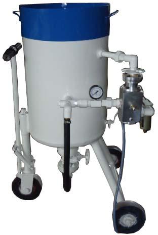 portable abrasive blaster pressure feeds the system of abrasive propelling and results in higher production rates. The pressure vessels are tested to 250 psig and coded. Blast nozzles special design and tungsten carbides lined, result in long service life. It is equipped with high static and low weight blast hose. The remote control on off is in operators' hand and requires no electric connection.