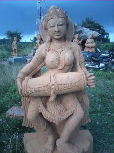 Brownish Sand Stone Devdasi Statue With Dhol, For Office, Home, Garden, Style : Antique