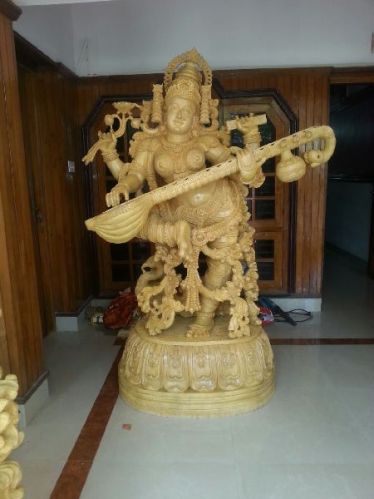 Hand Carved Wooden Saraswati statue * Saraswati is the radiant Hindu Goddess of Wisdom and wife of Brahma the creator * She holds a veena, prayer malas and a copy of the hindu holy vedas