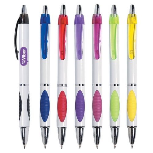 Sassy ballpoint pen with rubber grip for writing comfort and control. Come in designer colors with matching accents and include plunger action. Great giveaway for any event or trade show. Ensure your clients remember you and write away the competition with these great pens! Additional Information Medium point black inkWhite sassy ballpoint pen